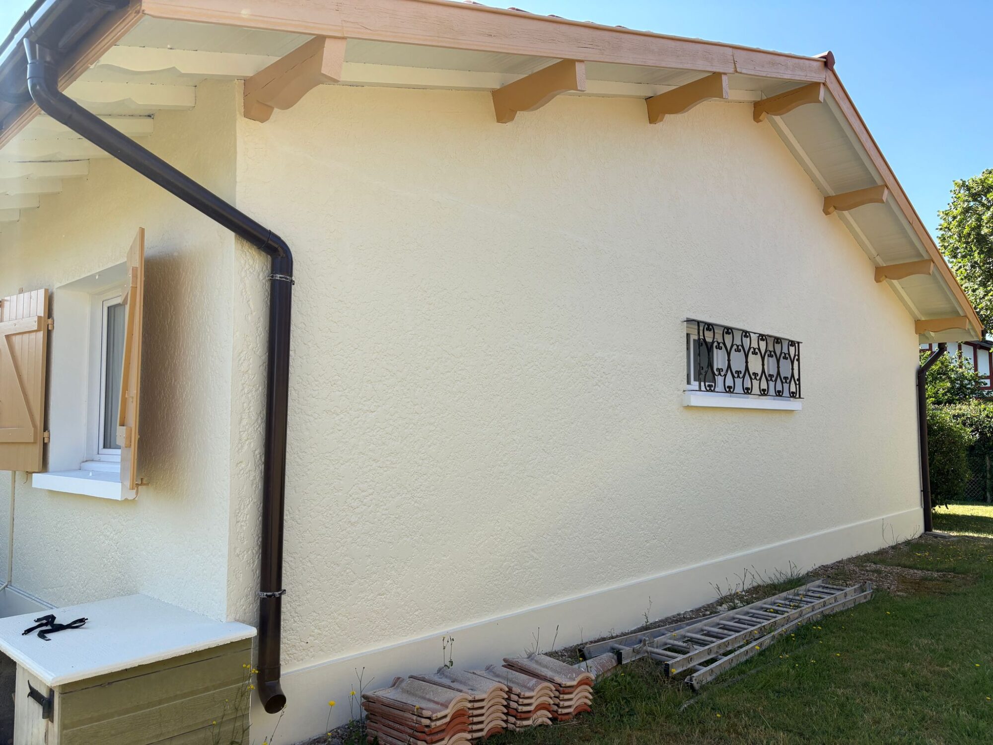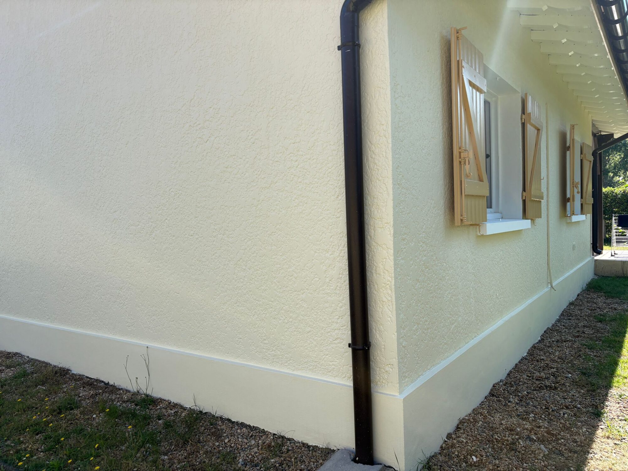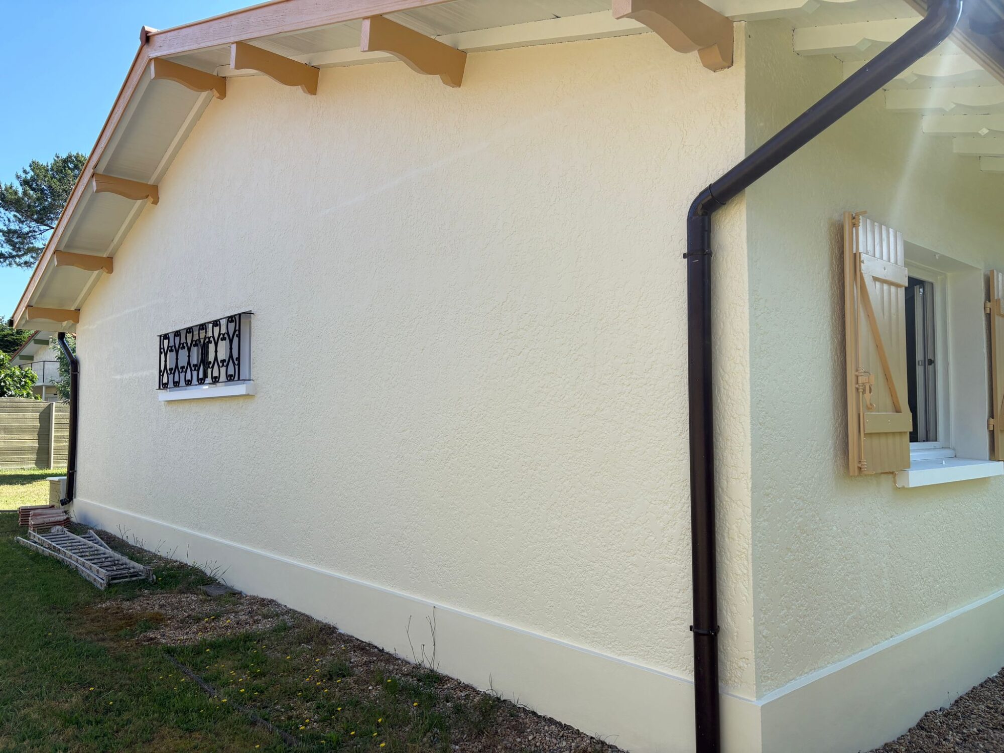Cette analyse nous a permis d’expliquer à notre client la meilleure solution pour réparer durablement les fissures tout en respectant l’architecture d’origine de la maison. L’objectif était double : sécuriser et consolider les façades, puis appliquer un revêtement souple à base de résine, idéal pour masquer les défauts tout en redonnant un aspect neuf et une nouvelle teinte aux façades.