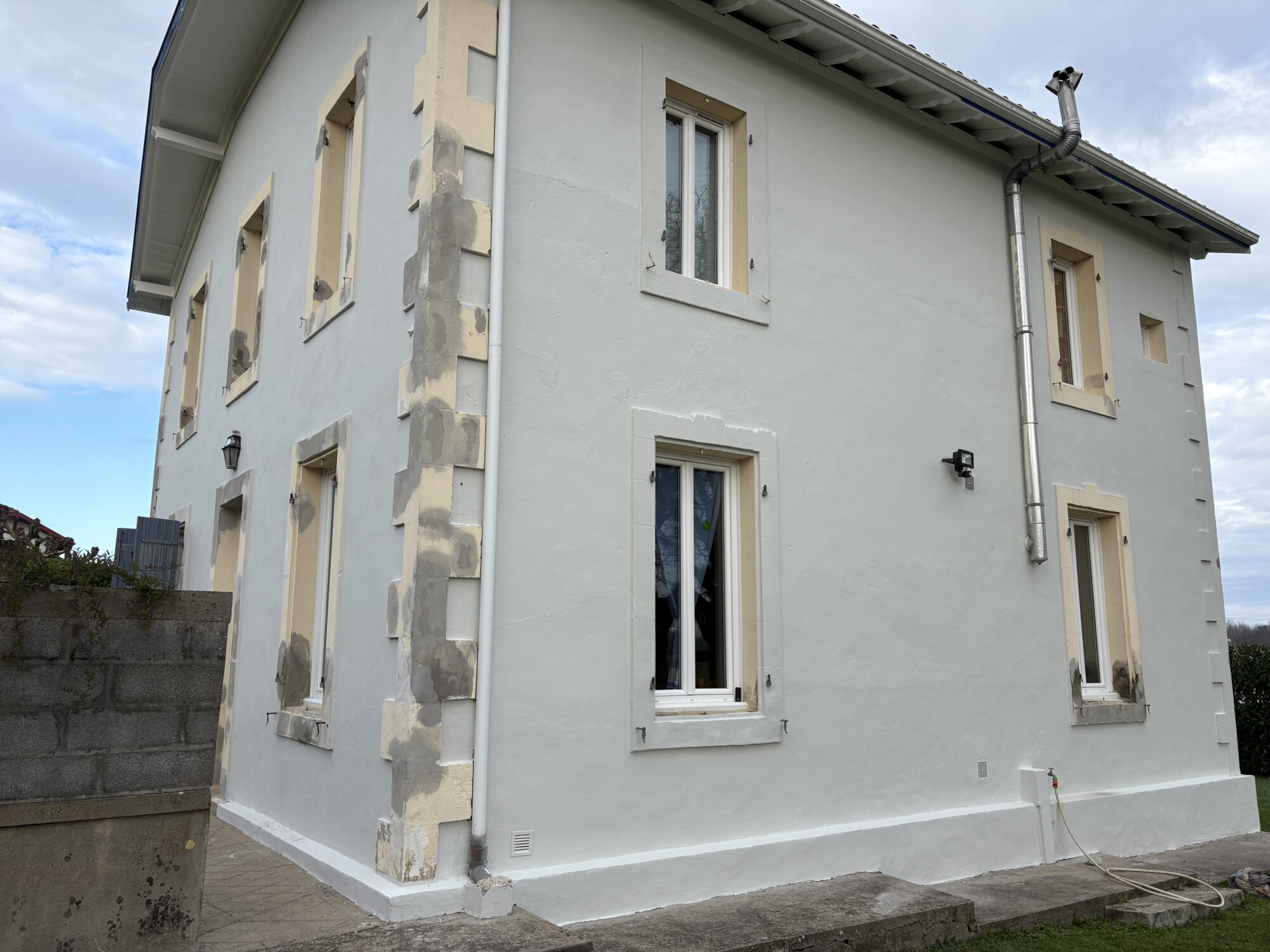 Pour cette réalisation de ravalement de façade sur une maison individuelle à Onard, à côté de Dax, nous avons commencé par une étude complète de l’état des façades afin de définir les solutions les plus adaptées. L’analyse a mis en évidence des dégradations localisées au niveau des encadrements de menuiseries et des soubassements, nécessitant une remise en état avant tout traitement de finition. Ces zones sensibles, soumises aux intempéries et à l’humidité, ont été réparées et renforcées afin d’assurer la pérennité des façades.