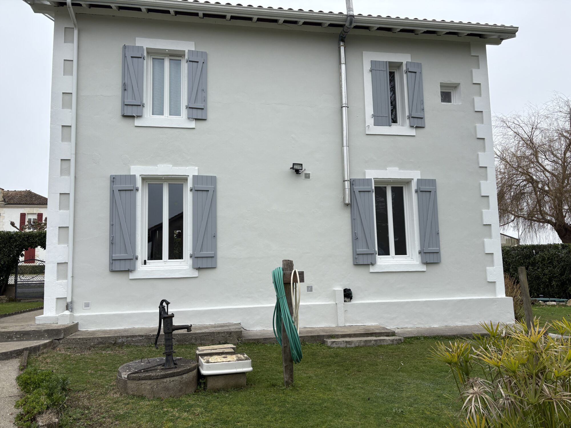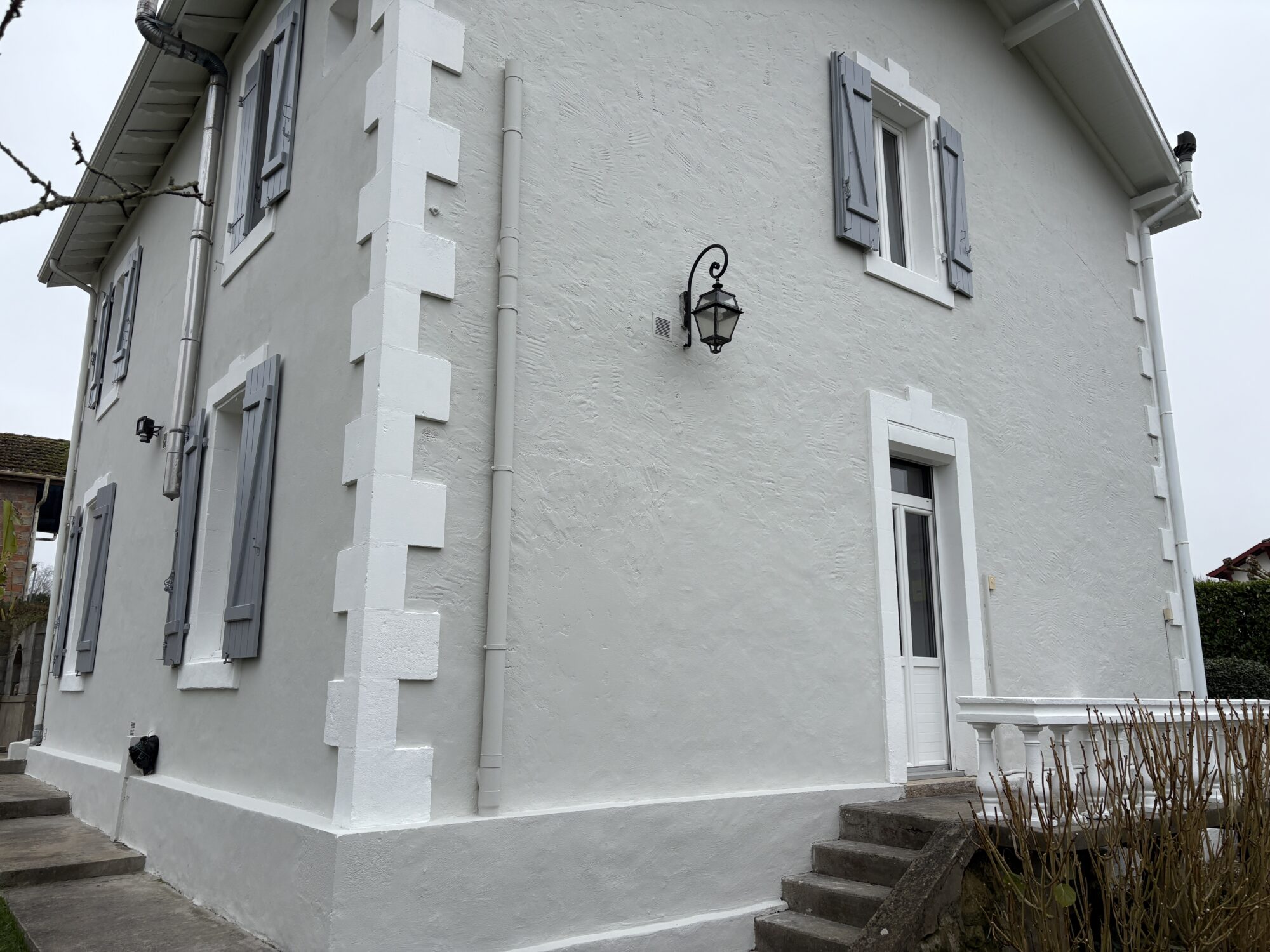 Pour ce chantier de ravalement de façade de maison individuelle à Onard, à proximité de Dax, notre équipe de façadier à mis en œuvre une méthodologie rigoureuse afin de garantir un résultat durable. Les façades ont d’abord fait l’objet de travaux préparatoires essentiels, comprenant le piquage des parties non adhérentes, la décontamination au VERTIKAL NETTOYANT I et le lavage complet des murs extérieurs. Les fissures existantes ont ensuite été ouvertes, grattées puis rebouchées avec le VERTIKAL FISSURES F afin d’assurer une surface saine et homogène. Un traitement spécifique avec le VERTIKAL STOP SEL a été appliqué pour neutraliser les remontées de sels minéraux et prévenir les dégradations futures. Une fois cette phase préparatoire terminée, la phase de finition a débuté par l’application d’un primaire d’accroche, le VERTIKAL CT, indispensable pour optimiser l’adhérence des revêtements sur le support. Enfin, la mise en peinture a été réalisée avec un revêtement semi-épais, le VERTIKAL RSE 50, offrant une protection renforcée et une finition esthétique durable, limitant avec sa souplesse le retour du faïençage et des microfissures.