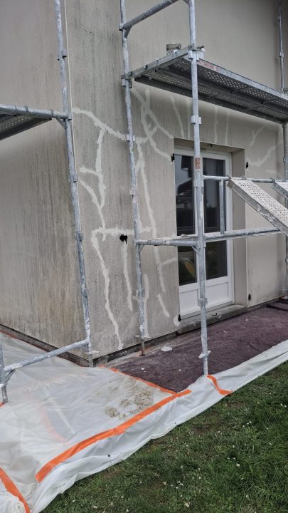 Nos façadiers qualifiés ont commencé par des travaux préparatoires essentiels afin de garantir la durabilité et la qualité du revêtement de façade. Cette étape comprend le piquage des zones non adhérentes, la décontamination des supports avec le VERTIKAL NETTOYANT I, ainsi qu’un nettoyage complet des murs extérieurs pour éliminer toutes les impuretés.