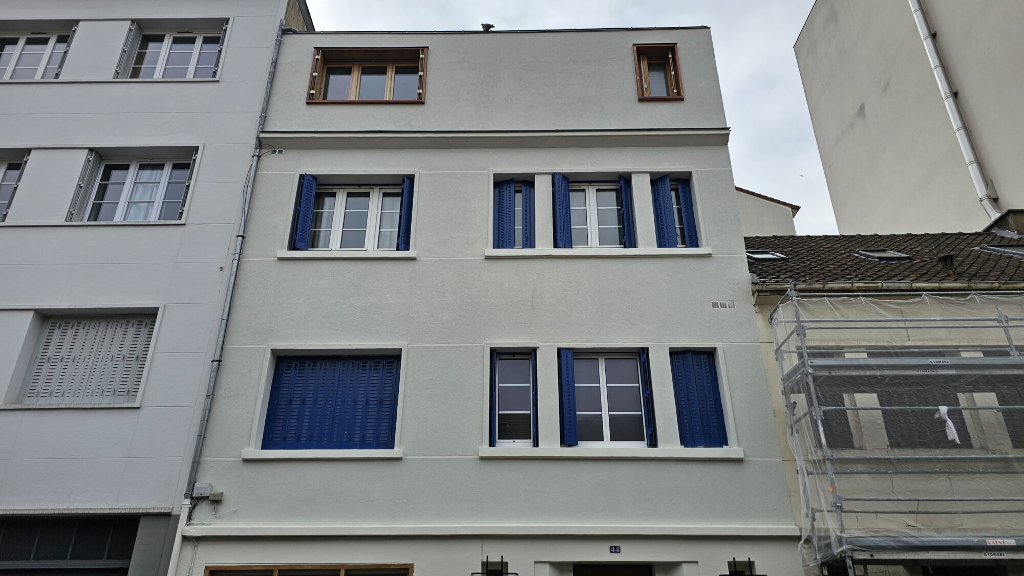 Avant toute intervention, nos équipes ont procédé à un diagnostic complet des façades. Celles-ci présentaient un encrassement important lié à l’environnement urbain ainsi que plusieurs fissures nécessitant un traitement adapté. Après obtention des autorisations nécessaires, un échafaudage a été mis en place afin de sécuriser les travaux en hauteur.
