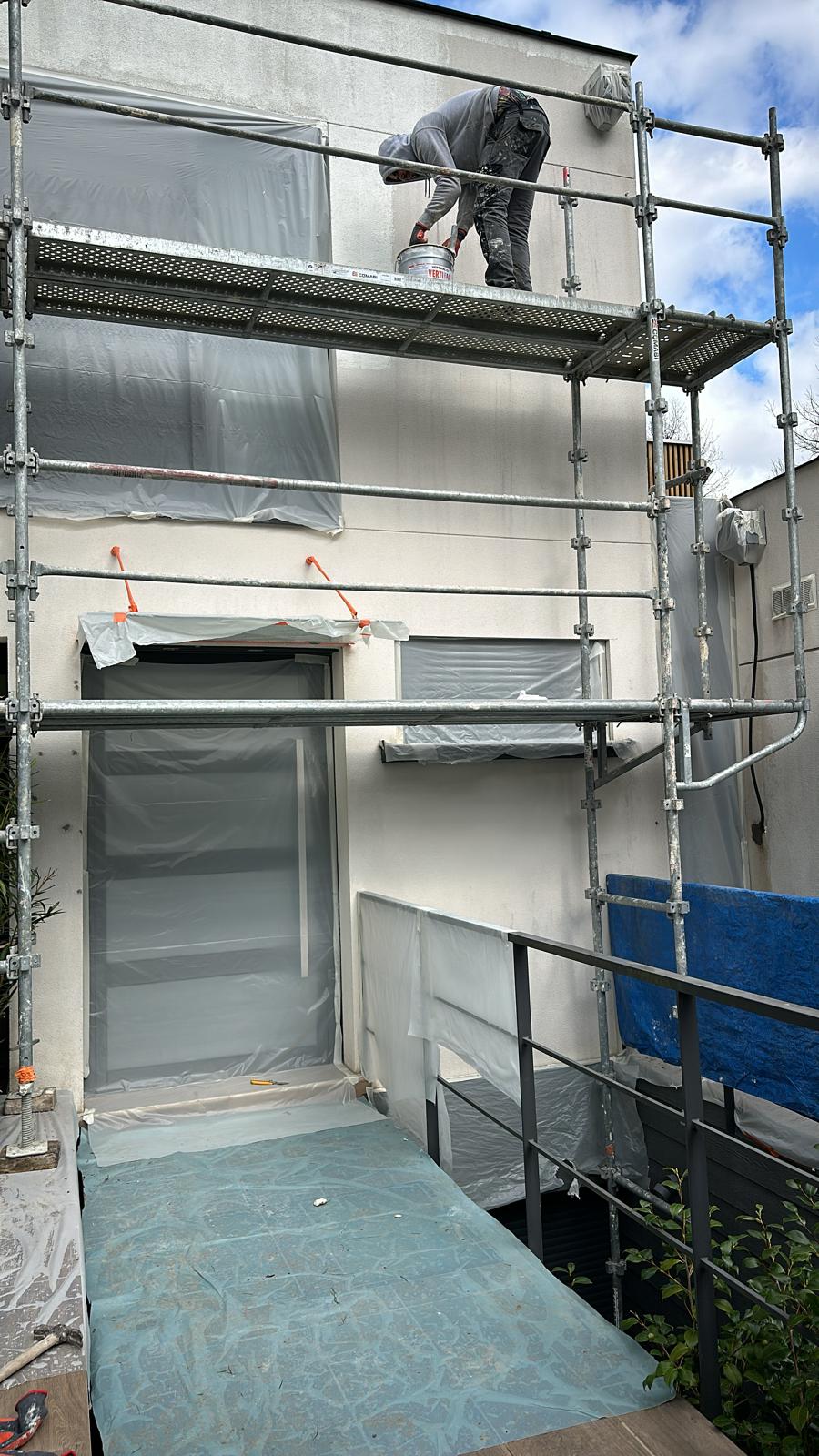 Située à Meudon, cette maison d’architecte se distingue par ses lignes contemporaines et ses volumes géométriques affirmés. Le propriétaire souhaitait engager un ravalement de façade afin de protéger durablement les murs tout en renforçant l’esthétique moderne de l’habitation. Quelques fissures étaient apparues sur le crépi et nécessitaient un traitement adapté. L’enjeu principal était de conserver l’esprit architectural de la maison tout en mettant en valeur ses volumes par une finition sobre, élégante et durable, associant deux teintes contrastées.