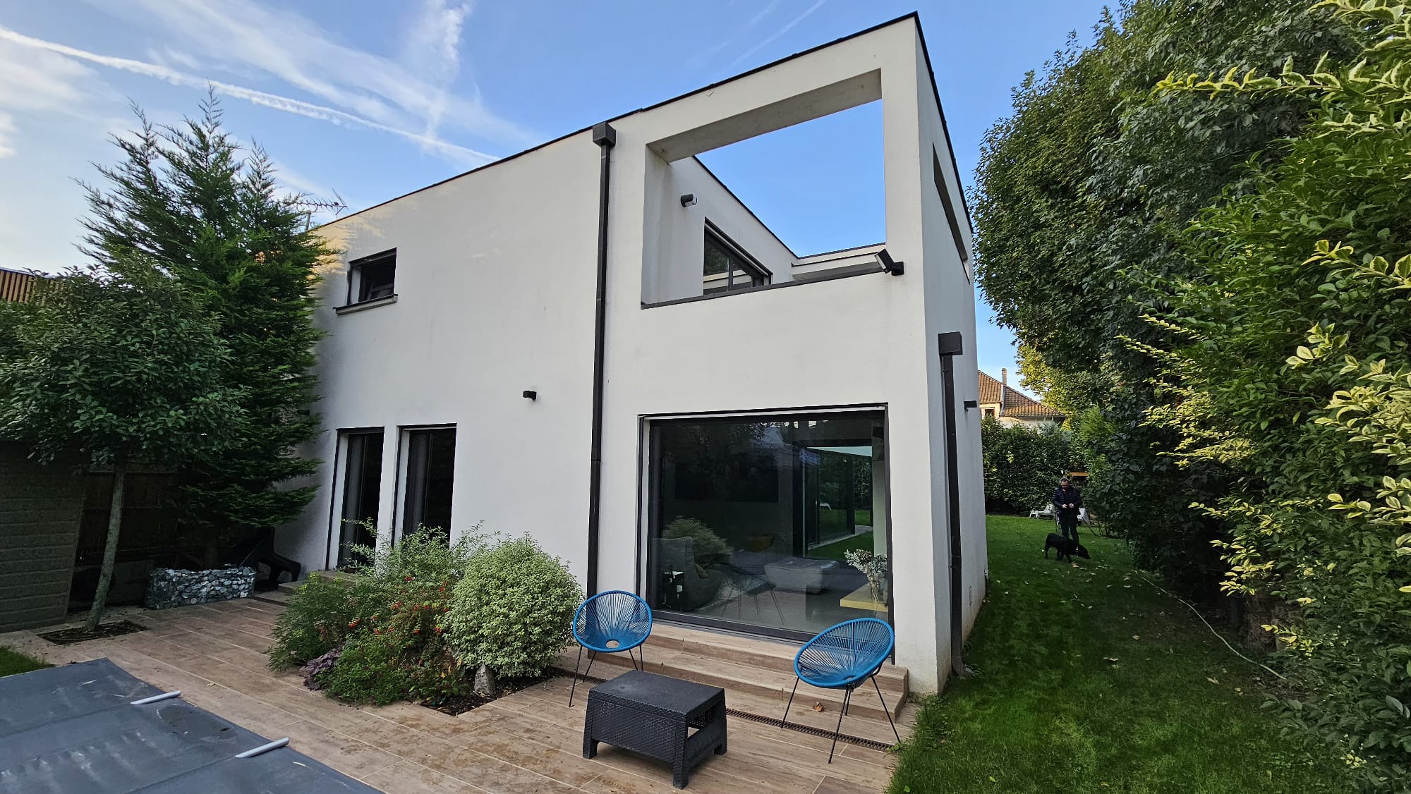 Le volume cubique de la maison a été traité avec le VERTIKAL-FLEX GT 100, appliqué à la taloche en teinte Gris, afin de créer un contraste esthétique marqué. Ce revêtement épais structuré apporte du relief à la façade et met en valeur les lignes architecturales.