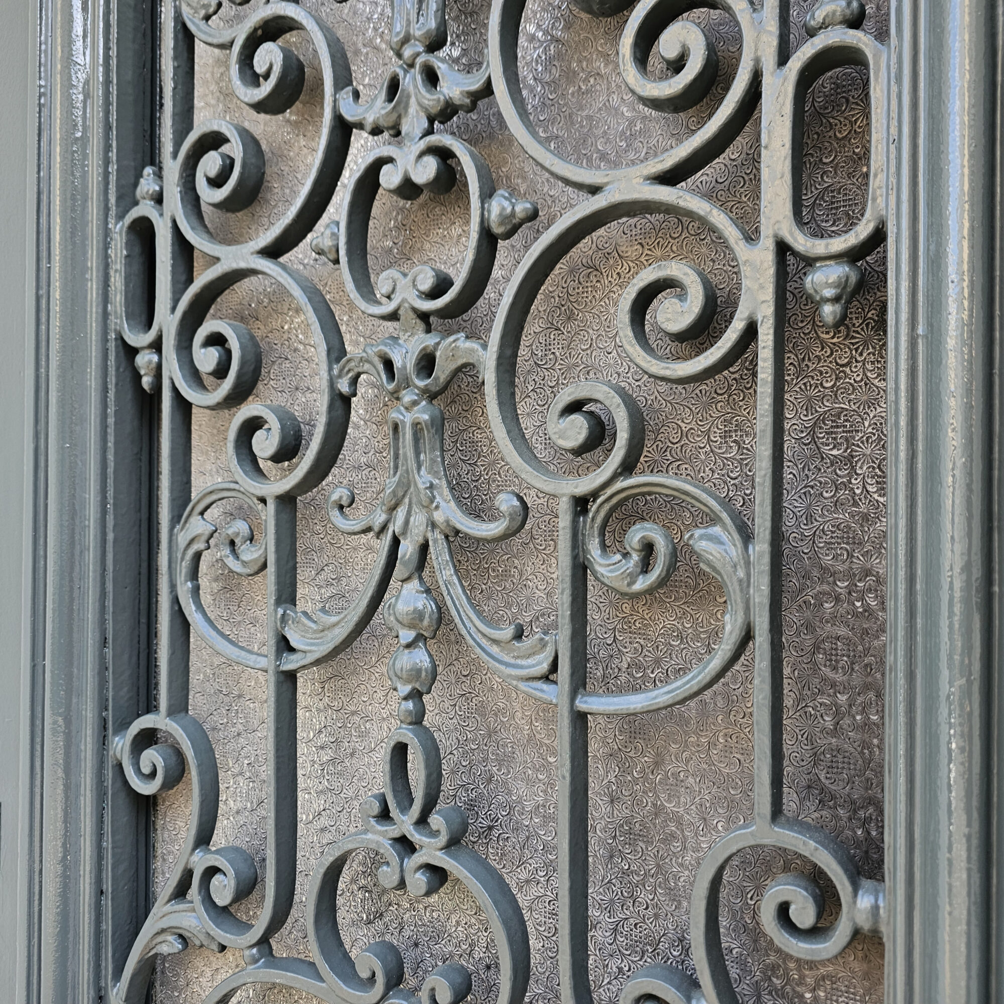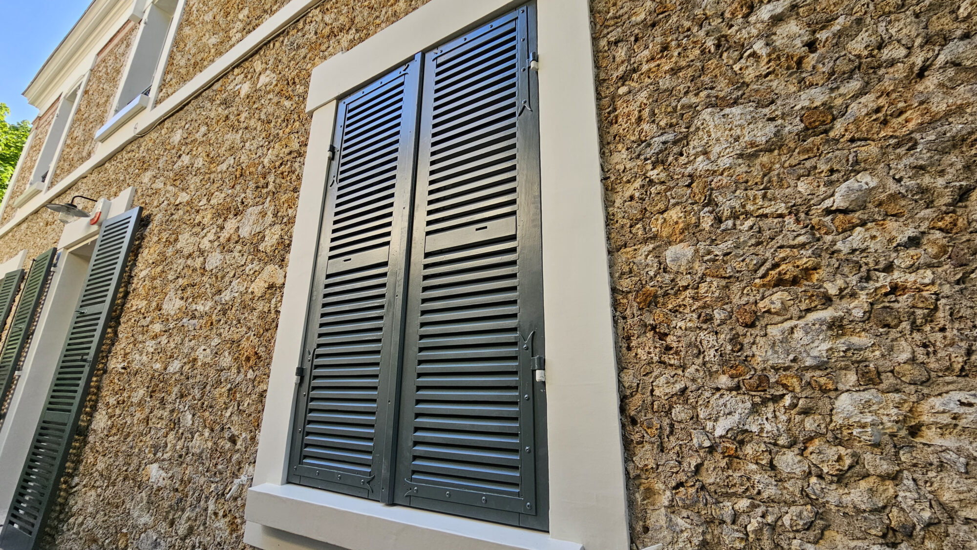Enfin, les ferronneries et menuiseries extérieures ont été repeintes dans une teinte bleu-vert profond, créant un contraste raffiné et mettant en valeur le cachet architectural de la maison.