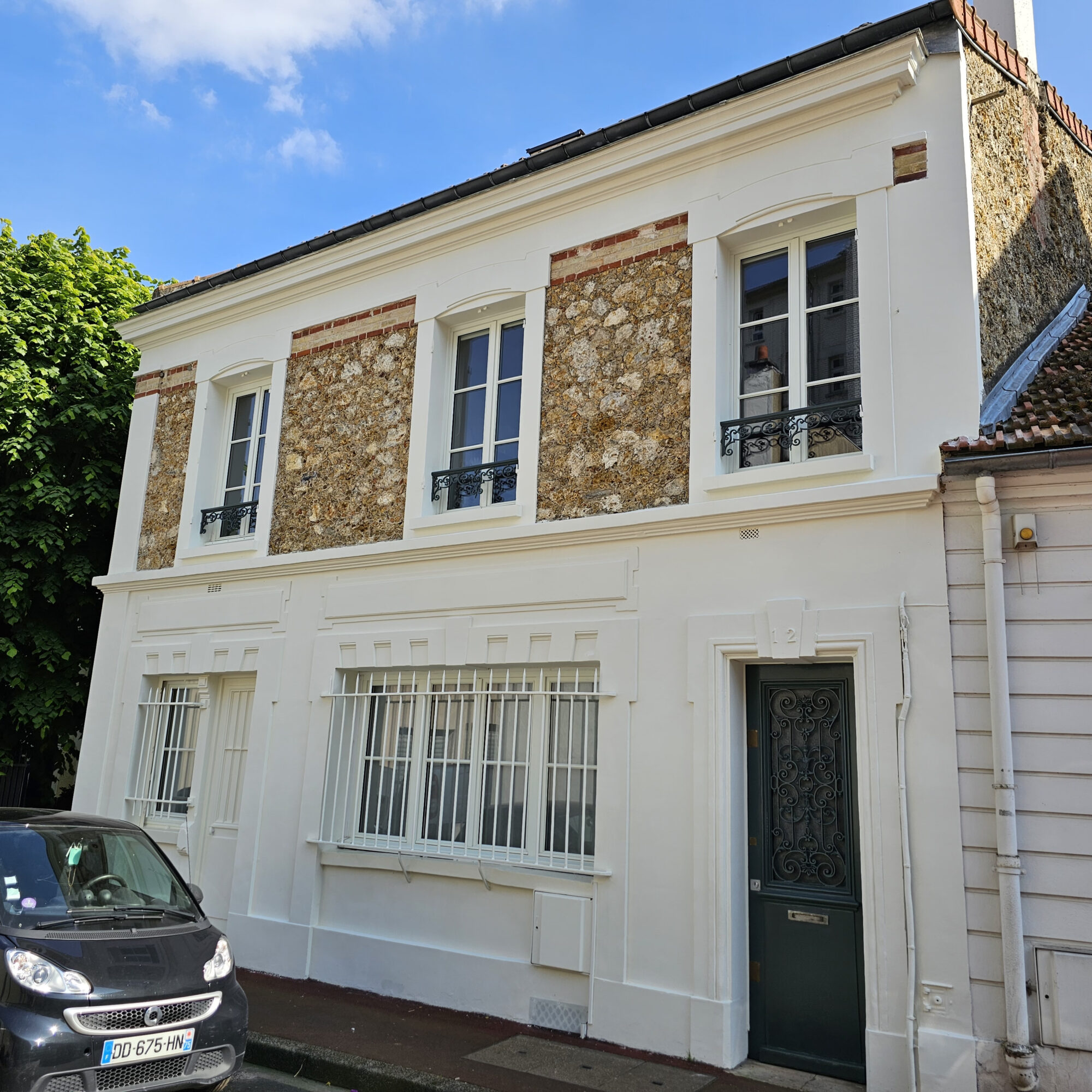 Le diagnostic initial a mis en évidence des remontées capillaires affectant les murs périphériques, des peintures écaillées sur les zones enduites et une oxydation avancée des ferronneries. Ces désordres, fréquents sur les maisons anciennes en pierre meulière, nécessitaient une approche globale et respectueuse du support.