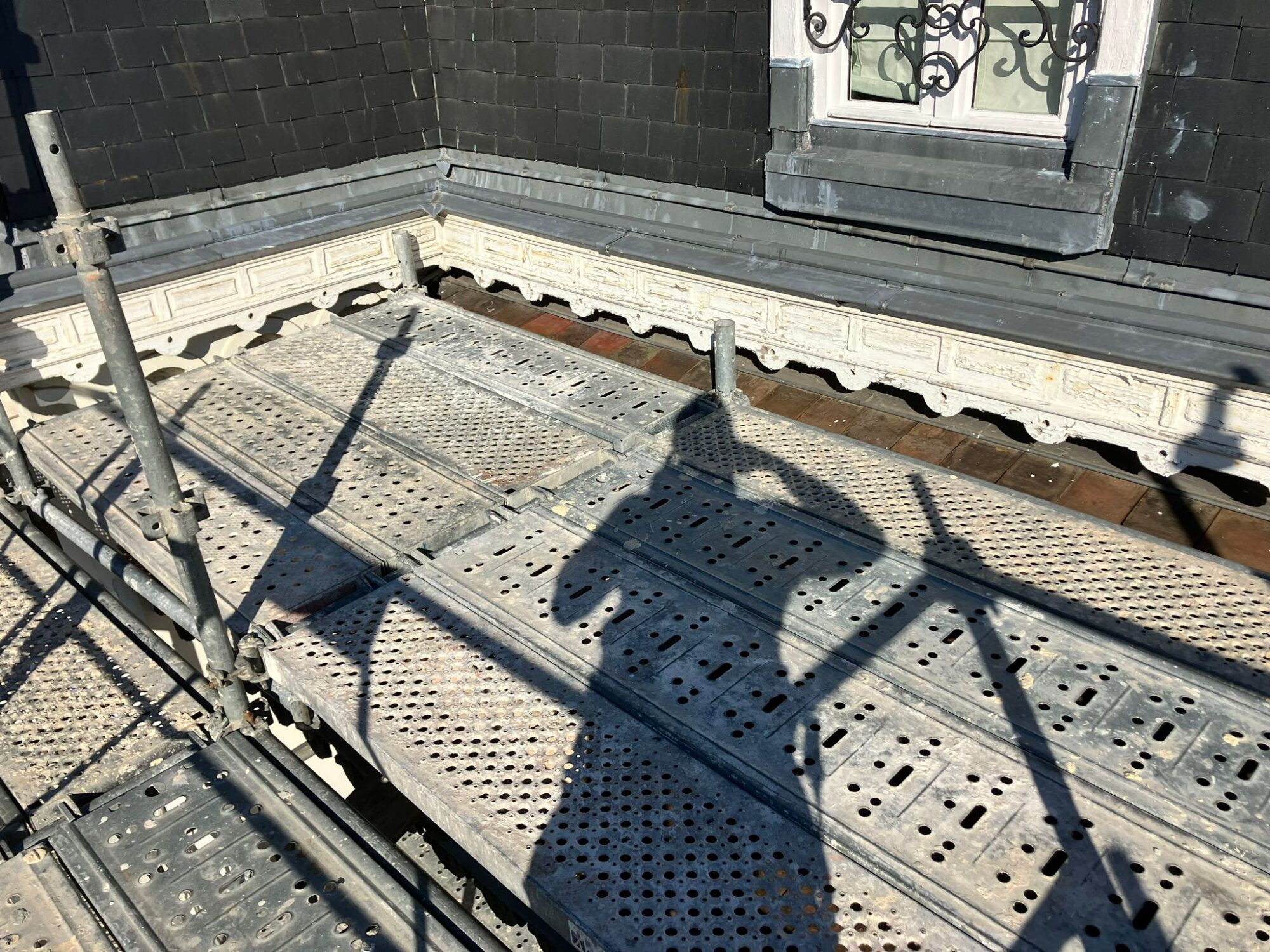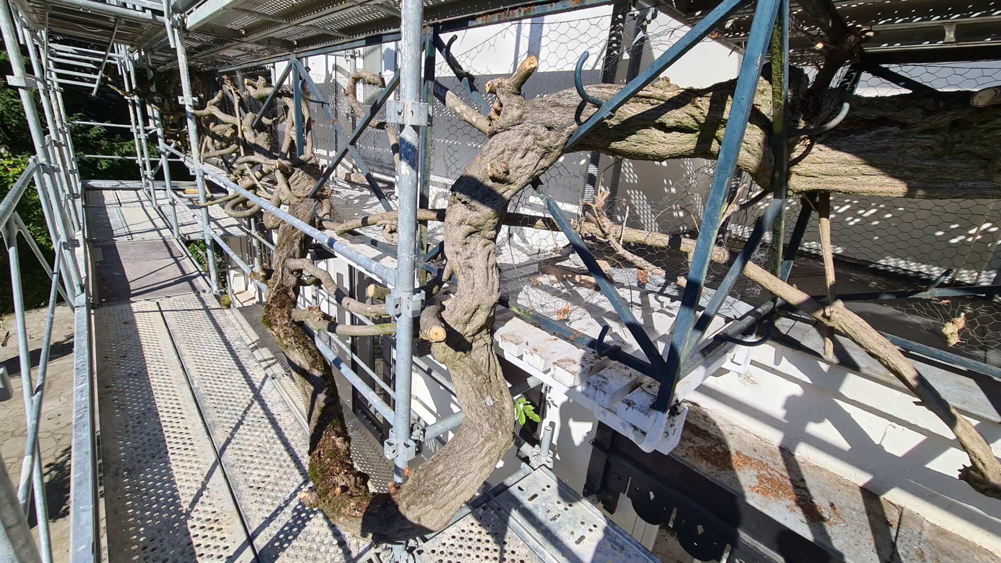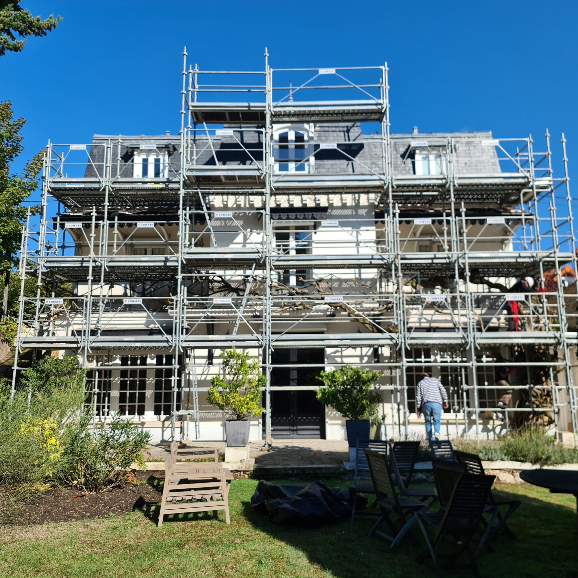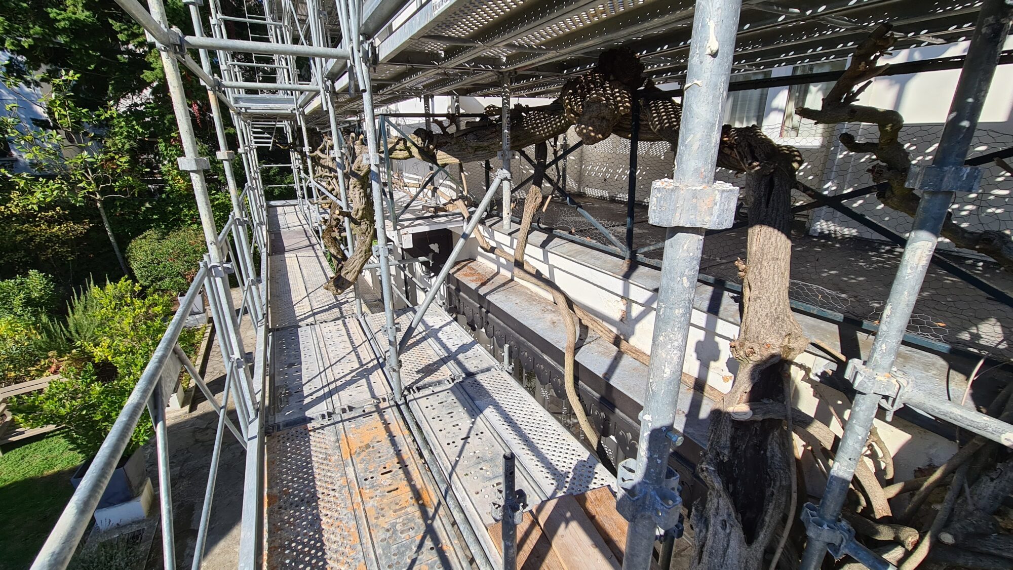 L’analyse du chantier a mis en évidence une configuration complexe, liée à l’accès restreint et à la proximité immédiate de la glycine. Afin de garantir la sécurité de la plante tout en assurant une intervention efficace, nous avons fait appel à un échafaudeur partenaire spécialisé. Un échafaudage multidirectionnel sur mesure a été conçu pour s’adapter précisément à l’espace disponible, sans contact ni contrainte mécanique sur la végétation.