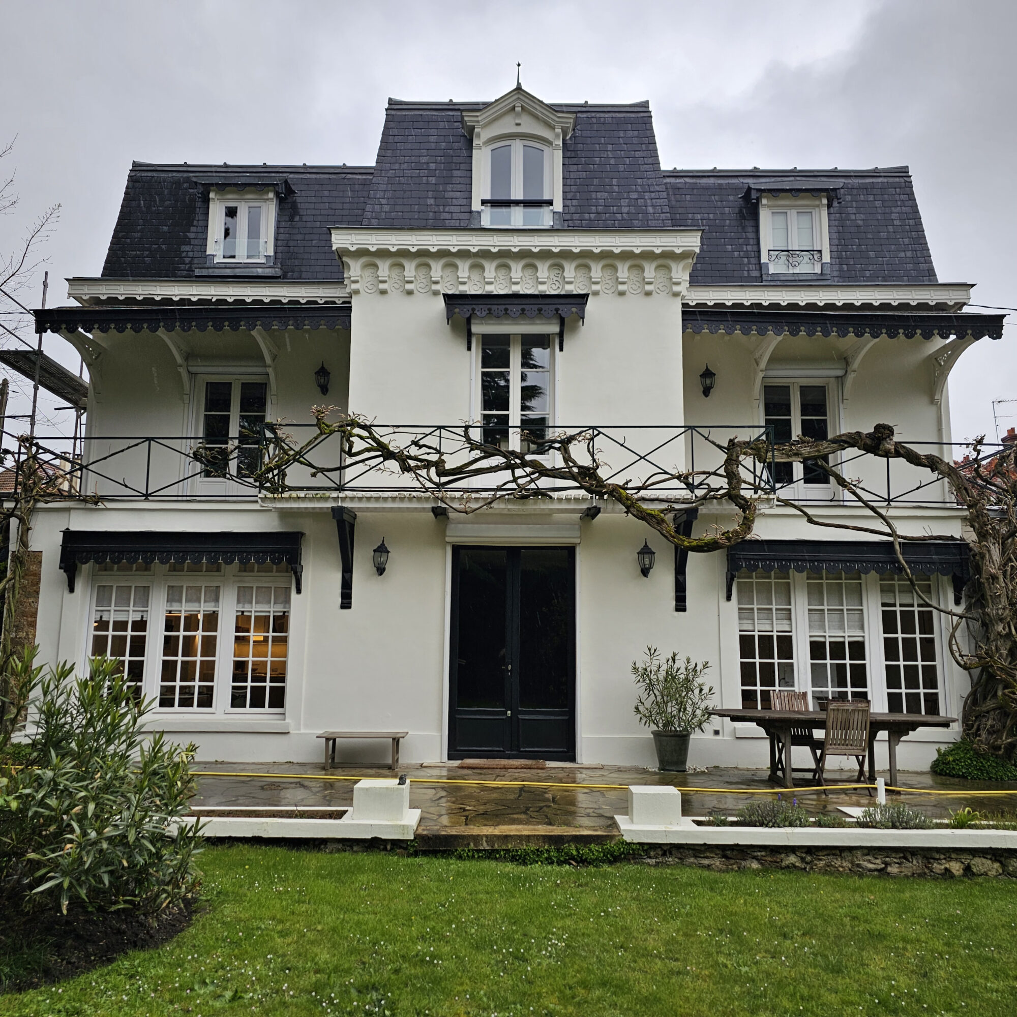 Située dans le quartier résidentiel de Petit-Garches, cette maison présentait une façade arrière dont l’aspect s’était terni avec le temps. Le client souhaitait redonner de l’éclat à la façade, tout en conservant l’esprit d’origine du bâti. En complément, l’ensemble des boiseries extérieures devait être rénové afin d’obtenir une harmonie visuelle durable.