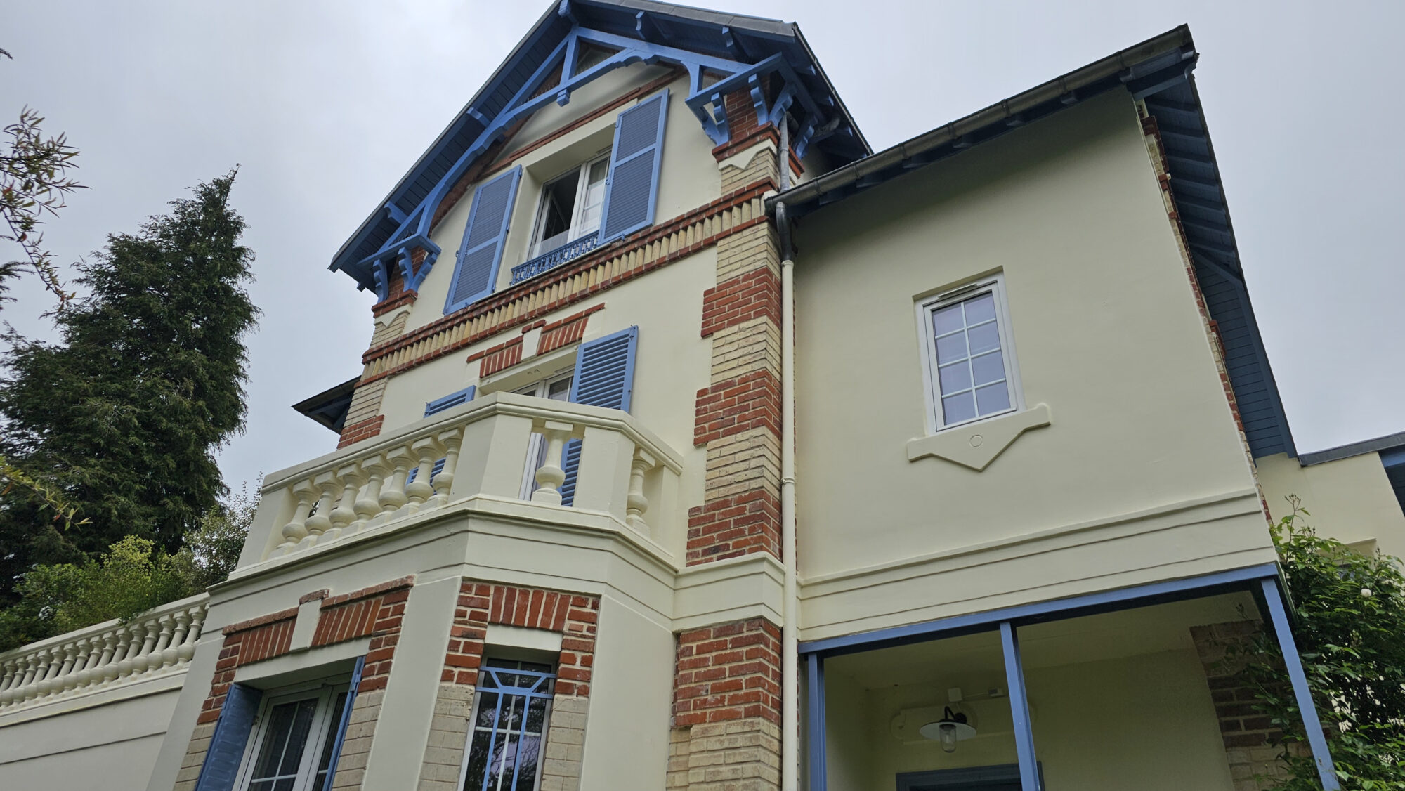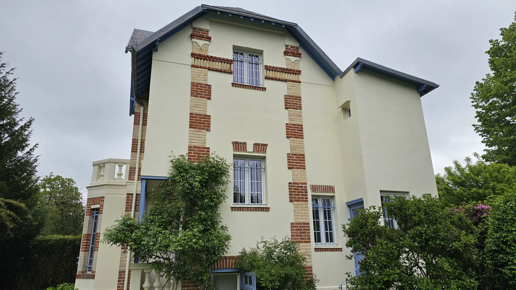 La teinte existante devait être strictement conservée, afin de préserver l’identité architecturale de la maison. Les modénatures, briques décoratives, boiseries anciennes, appuis de fenêtres et ferronneries devaient tous être restaurés avec soin, dans une logique de cohérence globale. Le client recherchait une entreprise expérimentée, capable de piloter un chantier complexe et exigeant, avec un niveau de précision irréprochable.