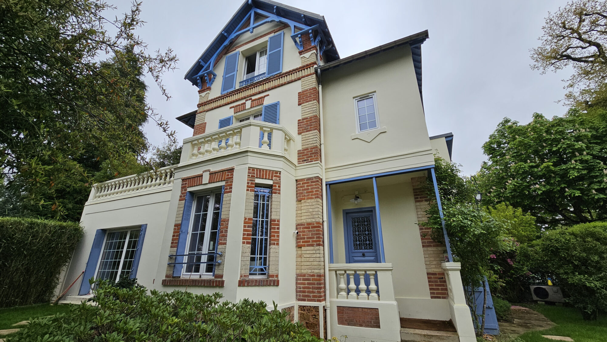 Implantée dans le quartier recherché de la Division Théry à Vaucresson, cette maison de caractère présentait des façades marquées par le temps : enduit cloqué, fissures visibles, peintures écaillées et boiseries altérées. Le propriétaire souhaitait un ravalement haut de gamme, à la hauteur du standing de son bien, avec une exigence forte sur la qualité des finitions, la fidélité à l’esthétique d’origine et la durabilité des solutions mises en œuvre.