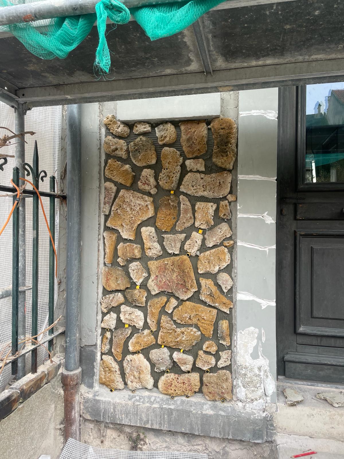 Un parement en pierre meulière sélectionnée pour son aspect moellon caverneux et sa patine naturelle a ensuite été mis en œuvre. Chaque élément a fait l’objet d’un calepinage précis, en croisant les joints et en évitant tout alignement vertical, afin de reproduire l’aspect irrégulier et naturel des façades anciennes. Les angles ont été traités spécifiquement pour conserver une cohérence visuelle et un relief authentique.