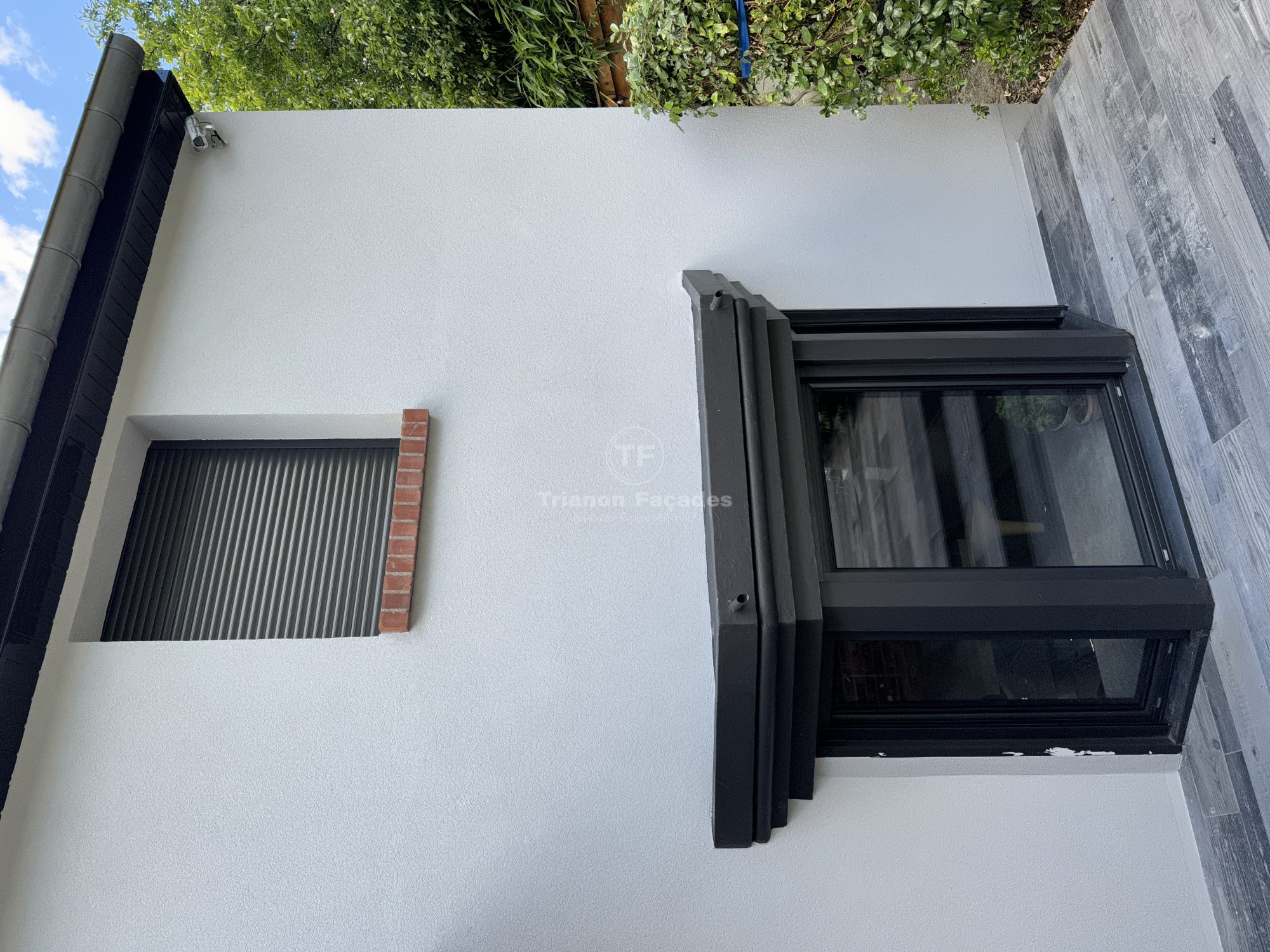 Nous avons ensuite appliqué un enduit de finition VERTIQUARTZ GT 50 gris, un revêtement haut de gamme spécialement conçu pour la rénovation. Grâce à sa formulation à base de résine, ce produit offre une grande souplesse, idéale pour prévenir les microfissures et accompagner les mouvements du bâti. Il assure également une excellente résistance aux intempéries et une durabilité optimale, tout en apportant un rendu esthétique moderne et uniforme.