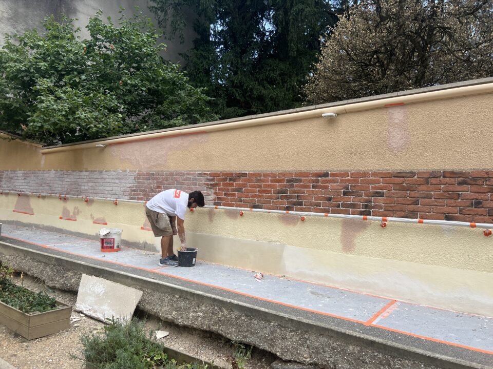 L’OGEC de l’école Sainte Blandine à Ecully 69130 souhaitait rénover ce mur d’enceinte donnant sur la cour de l’école, très endommagé par le temps, la pollution et surtout les élèves , n’hesitant pas à exercer leur créativité , au detriment de l’enduit en place.