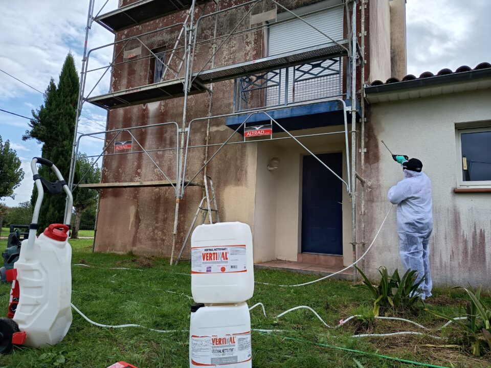 En tant que façadier à Montauban et sur tout le Tarn-et-Garonne, « Parlons Façades » a conseillé au propriétaire une prestation complète, alliant nettoyage et protection des façades. Pour le nettoyage, nous avons utilisé le VERTIKAL NETTOYANT I, un produit professionnel spécialement formulé pour éliminer en profondeur les traces noirâtre, rougeâtres, lichens, champignon et moisissures suivi d’un lavage moyenne pression. Nous avons du répéter cette opération deux fois afin de retrouver une surface saine et parfaitement propre avant la protection.