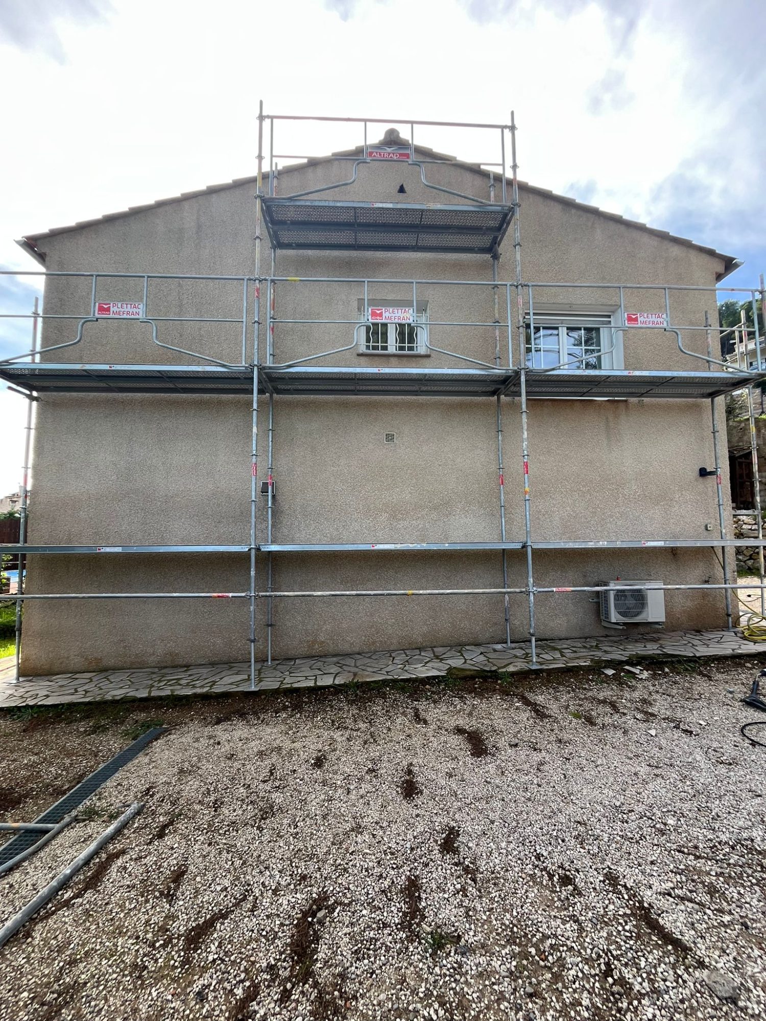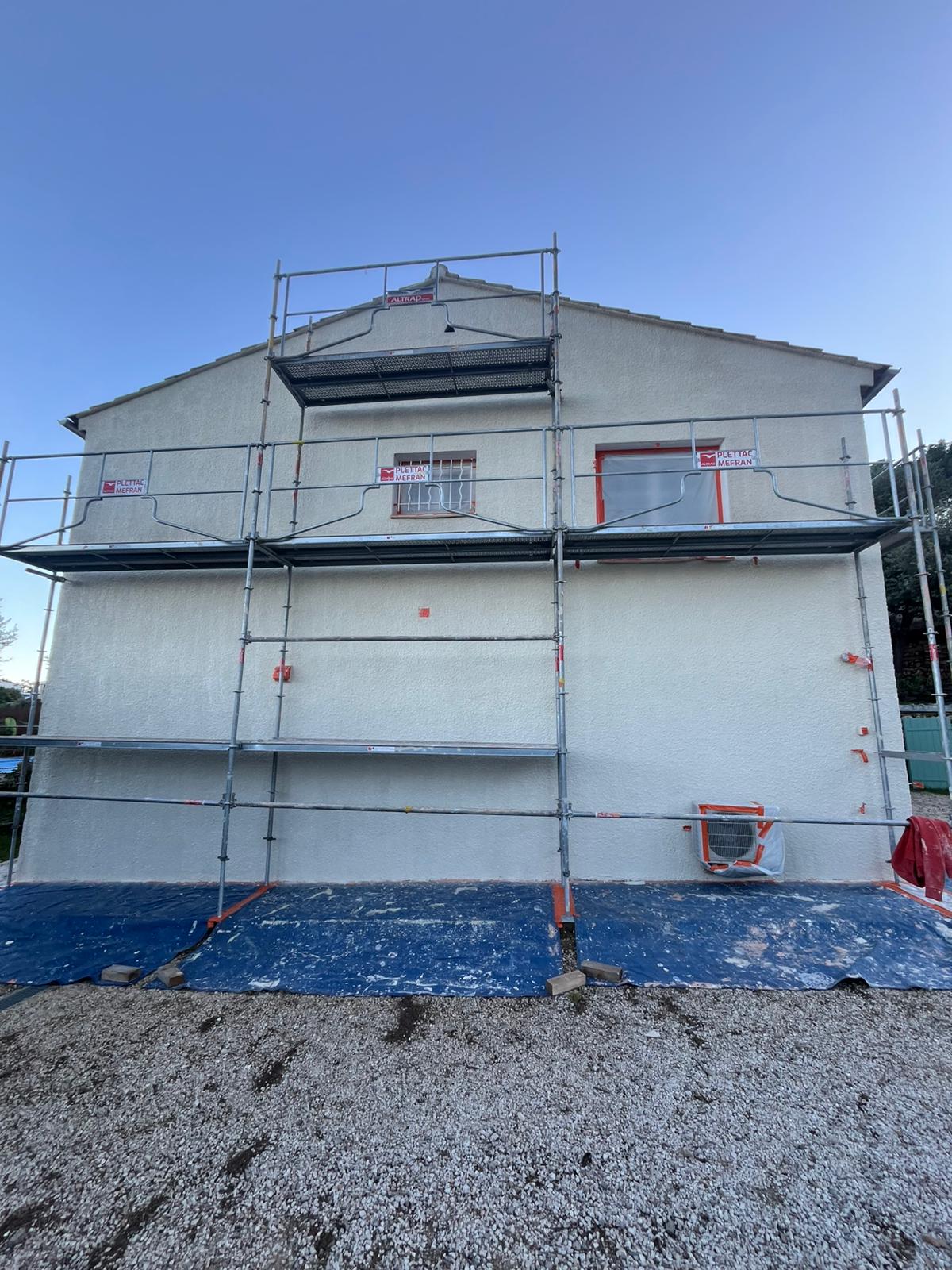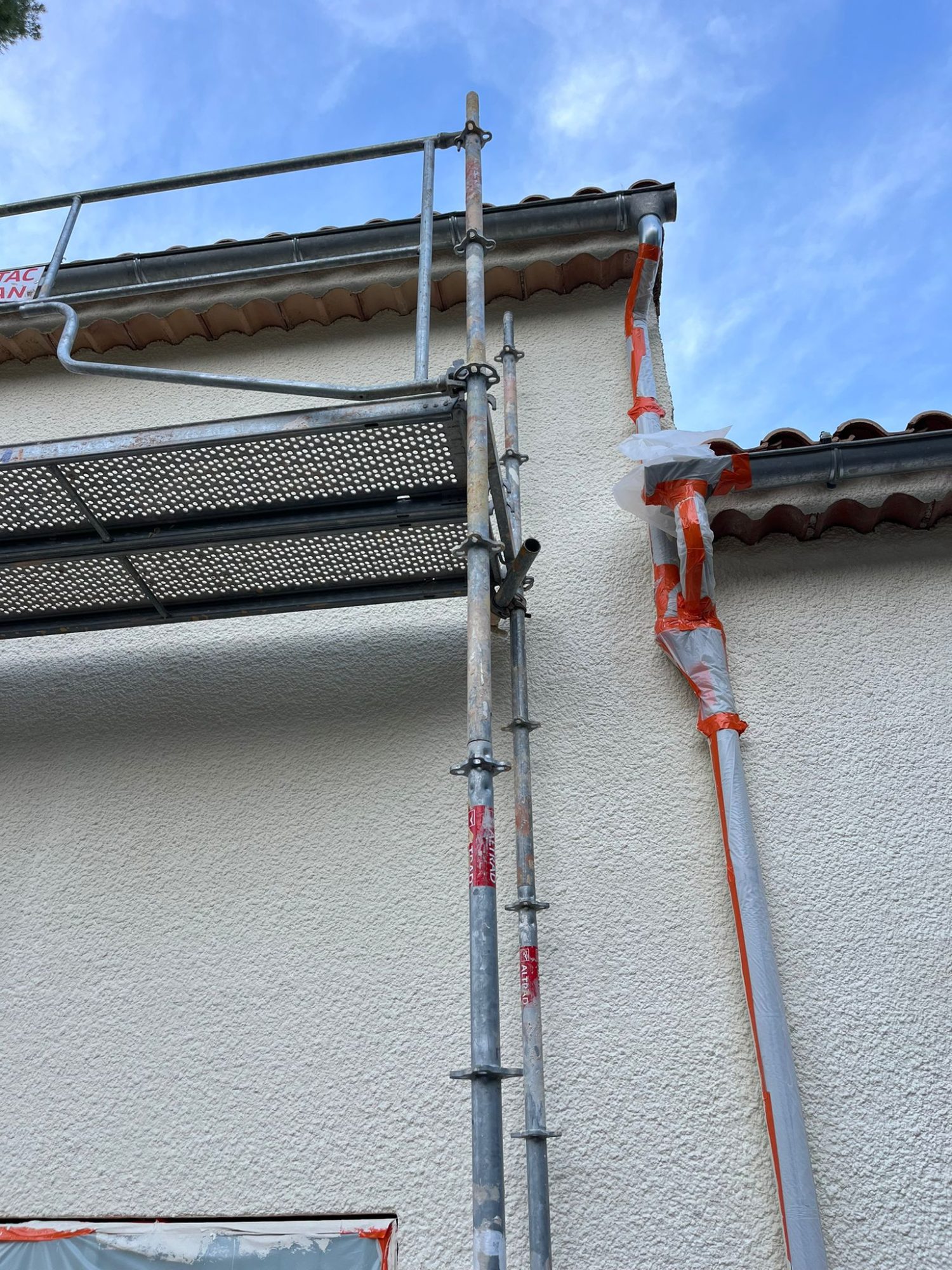 Conscients de l’importance d’une préparation rigoureuse, nous avons mis en place un échafaudage sécurisé permettant d’accéder à toutes les parties de la maison, tout en assurant la protection des éléments sensibles (fenêtres, portes, végétation).