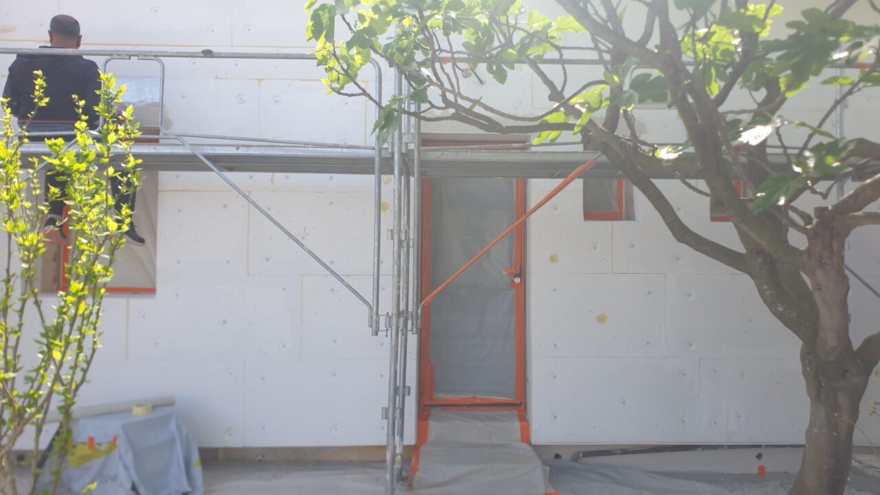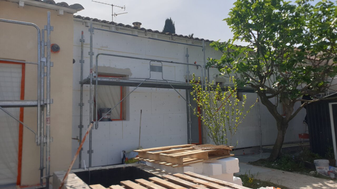 Le chantier du Crès (34920) a débuté par une phase de préparation minutieuse. Les façades ont été décapées et nettoyées, prêtent à accueillir le système isolant.