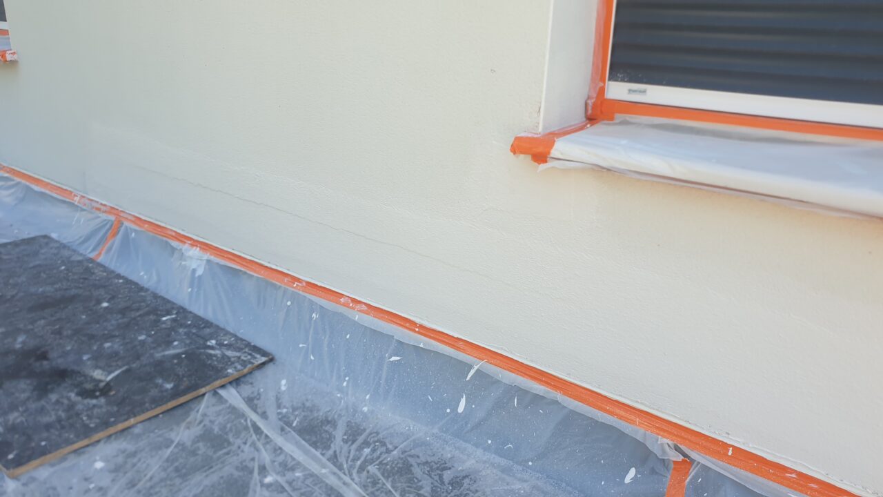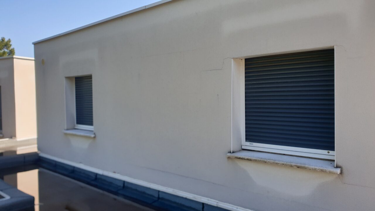Pour répondre à ses attentes, nous avons mis en œuvre une solution technique efficace : un traitement par pontage, appliqué localement sur les fissures en façade. Le pontage des fissures est réalisé avec un produit intermédiaire très souple, riche en résine, et renforcé par une armature en toile polyester. Ce système permet d’absorber les mouvements du support et de résister à une éventuelle réouverture jusqu’à 2 mm, tout en évitant toute fissuration visible en surface.